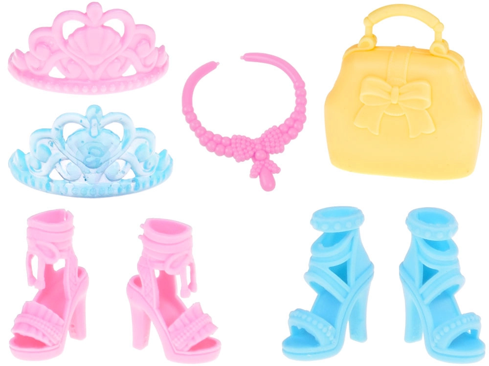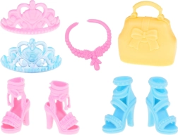 Divi eleganti augstpapēžu apavu pāri piešķir kopējam izskatam šarmu un stilu. Aksesuāri, piemēram, stilīga rokassoma, rozā kaklarota un divas kronītes, ir perfekti jebkurai mazajai princesei.