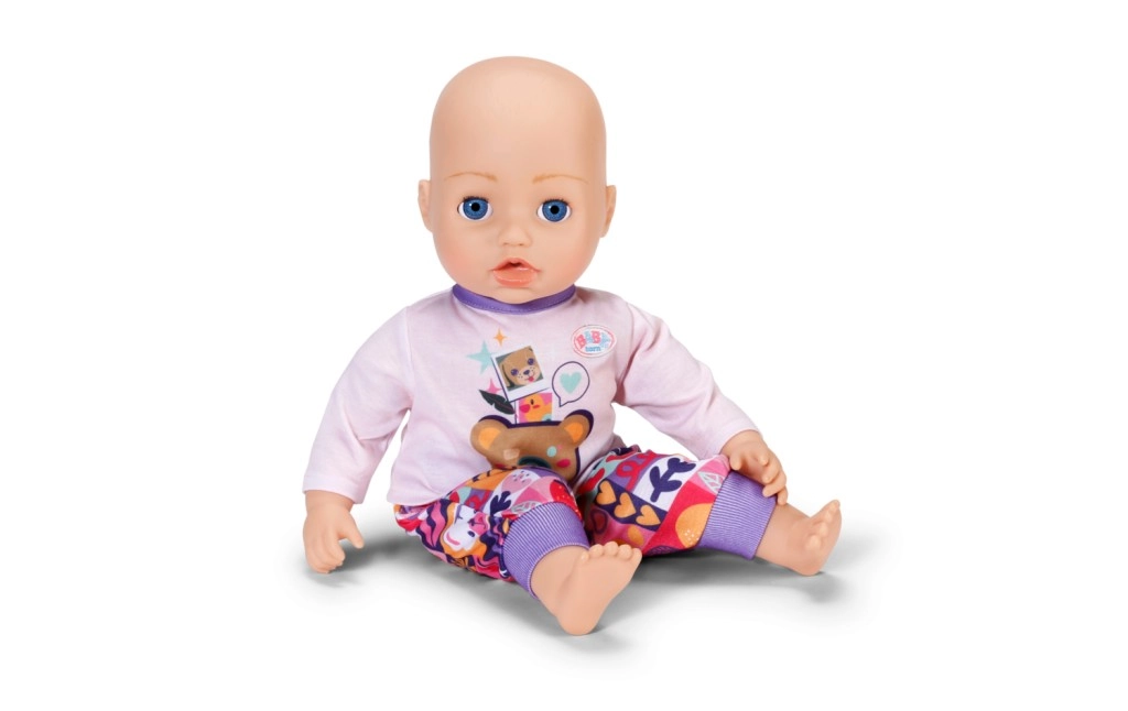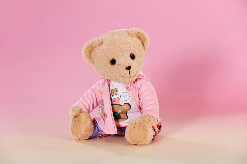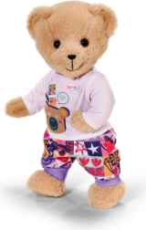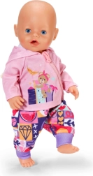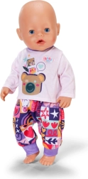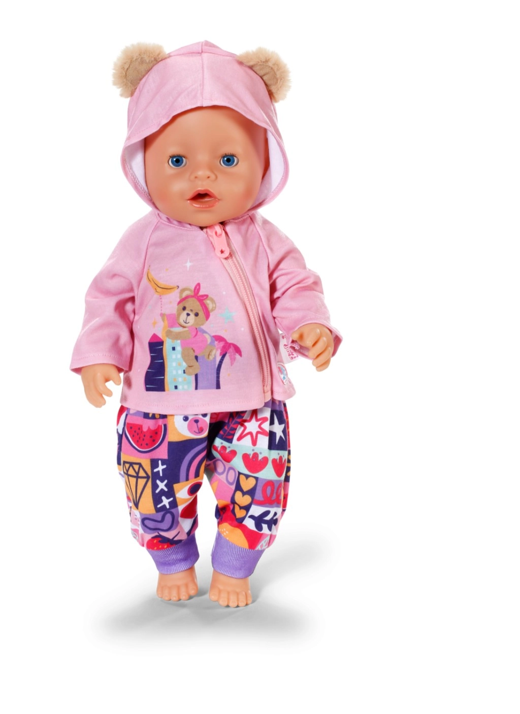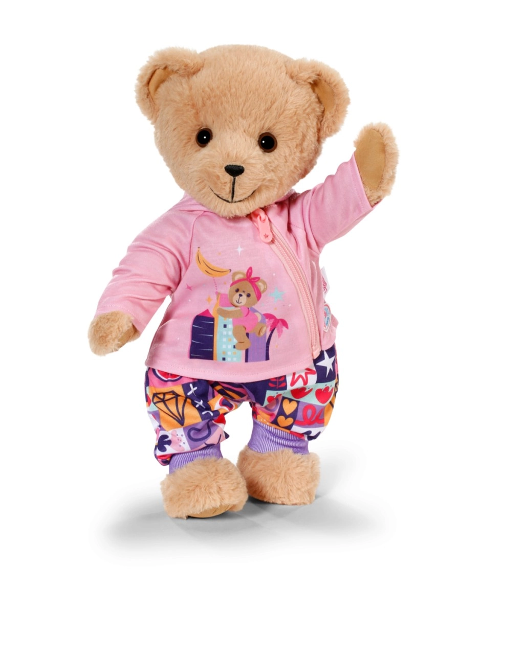 Ar šo apģērba komplektu Jūs piešķirsiet lellītei un arī BABY born Teddy lācītim komfortu un stilu katram piedzīvojumam. Rozā džemperis ar rāvējslēdzēju, kapuci un mīlīgām austiņām viegli uzvelkams, gaiši violets krekls ar garām piedurknēm un lācīti ir īpaši mīksts, bet bikses ar krāsainu pačvorka rakstu garantē ērtību rotaļās.