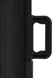 Izvelkamā barjera darbojas kā elastīga žalūzija no izturīga sietmateriāla, kas nodrošina redzamību un gaisa plūsmu, vienlaikus veidojot drošu norobežojumu. Pateicoties vienkāršai montāžai pie sienas un āķim pretējā pusē, to var atvērt un aizvērt ar vienu roku, bet satinot gandrīz neaizņem vietu.