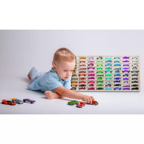 Parādiet mašīnīšu kolekciju tā, lai tā vienmēr būtu redzama un lieliski sakārtota. Plaukts no kvalitatīva koka saplākšņa piedāvā 80 praktiskus nodalījumus, lai katram modelim būtu sava vieta, un bērni bez ilgas meklēšanas viegli atrastu iemīļoto mašīnīti.