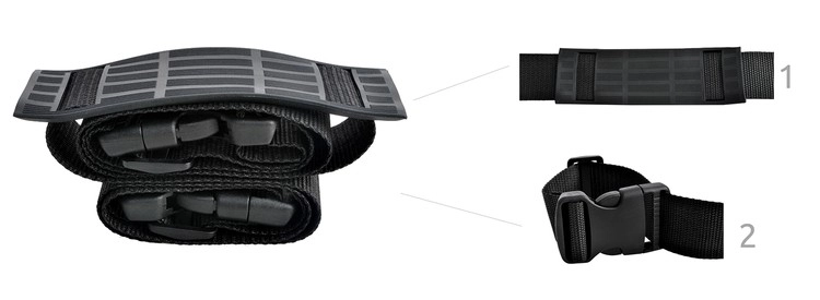 Divas izturīgas sprādzes nodrošina vienkāršu un uzticamu piestiprināšanu pie dažādiem balansa riteņu un skrejriteņu veidiem bez laikietilpīgas regulēšanas.