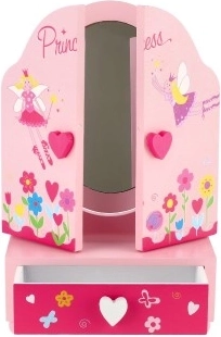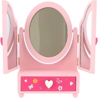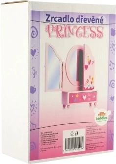 Mīlīgais bērnu tualetes spogulis ar rotu lādīti ar PRINCESS motīvu iepriecinās ikvienu mazo princesi. Trīsspārnu spogulis ar sānu daļām labākam skatam, praktiska atvilktne dārgumiem un izturīgs koka izpildījums maigi rozā tonī. Ideāli piemērots gredzenu, aproču un krellīšu glabāšanai un radošai spēlei.