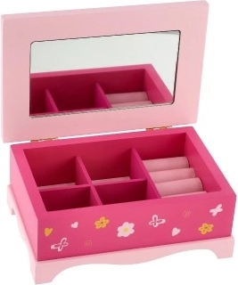 Šī rozā koka rotaslietu lādīte Princess apvieno pasakainu izskatu ar praktisku dalījumu. Pateicoties spogulītim vākā iekšpusē un pieciem pārdomātiem nodalījumiem, tā palīdzēs glīti sakārtot rotas un sīkumus. Smalkā ziedu dekorācija un uzraksts Princess veido burvīgu atmosfēru, kas lieliski iederas bērnu istabā.