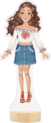 - Magnētiskā lelle, 30 magnētiskas detaļas (apģērbi, apavi, aksesuāri), koka pamatne
