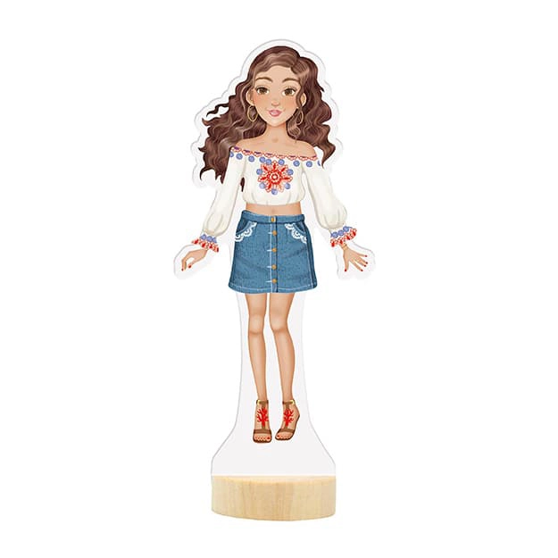Atklājiet radošo ģērbšanās pasauli ar šo magnētisko lelli, kas piedāvā 30 magnētiskas detaļas apģērbu, apavu un aksesuāru kombinēšanai. Pateicoties koka pamatnei, lelle ir stabila, un bērni var viegli radīt neskaitāmas modes kombinācijas gan mājās, gan ceļā.