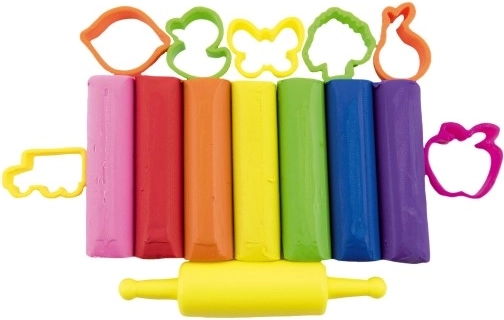 Komplektā ir plastilīns dažādās krāsās – rozā, sarkanā, oranžā, dzeltenā, zaļā, zilā un violetā.