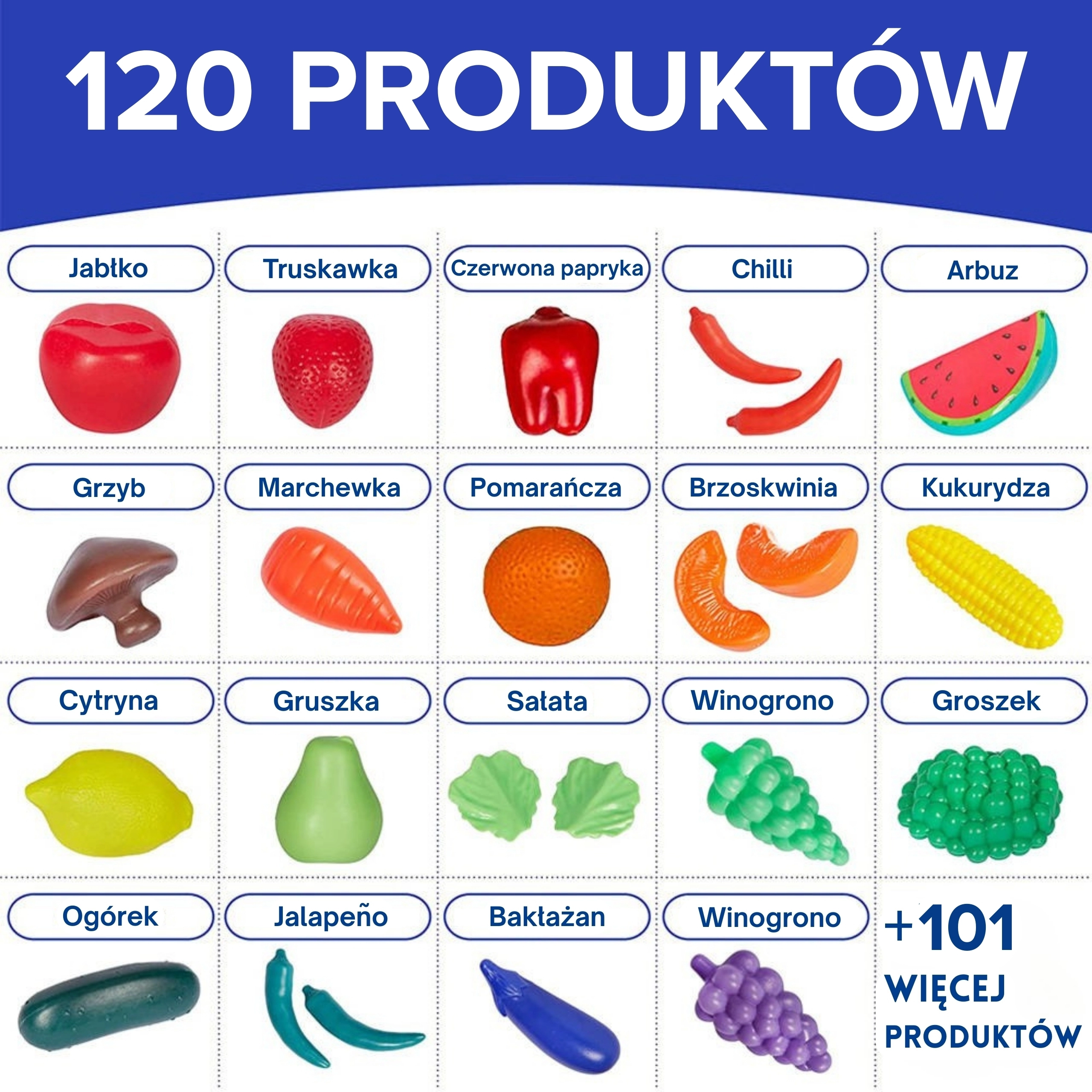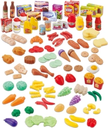 Komplektā ietilpst: 120 dažādi elementi, tostarp augļi, dārzeņi, maize un konditoreja, uzkodas, dzērieni un iepakojumi.