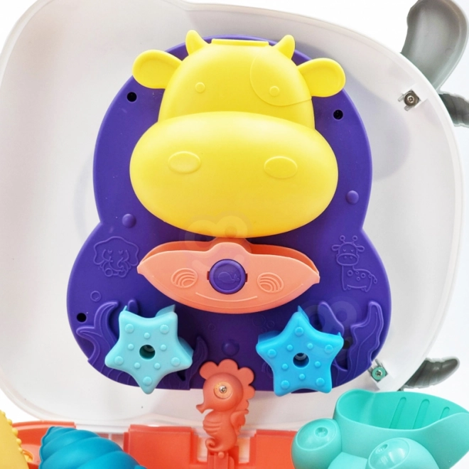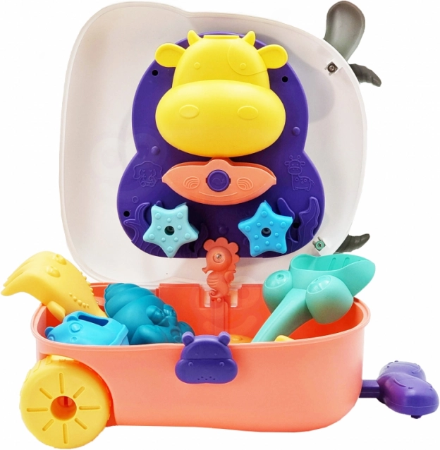 Noliekot koferīti “uz muguras”, izveidosiet vienkāršu ūdens galdiņu – piepildiet apakšējo daļu, pārlejiet ar krūzīti un vērojiet ūdens plūsmu. Komplekts ir piemērots bērniem no 3 gadu vecuma un piedāvā izklaidi arī diviem.