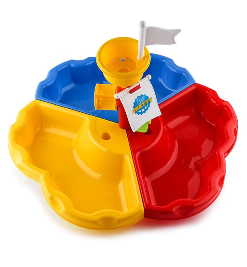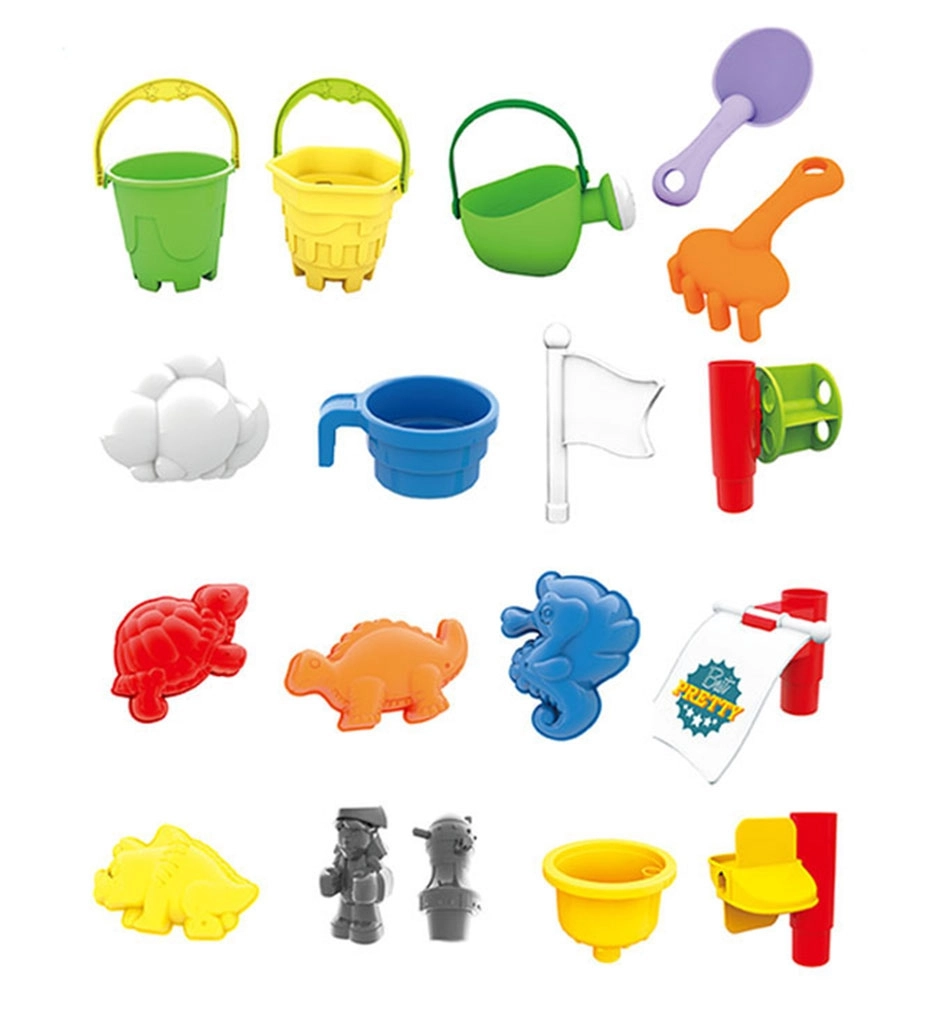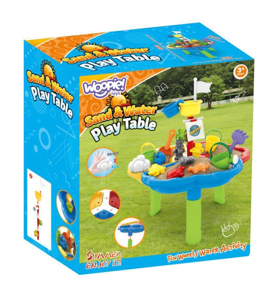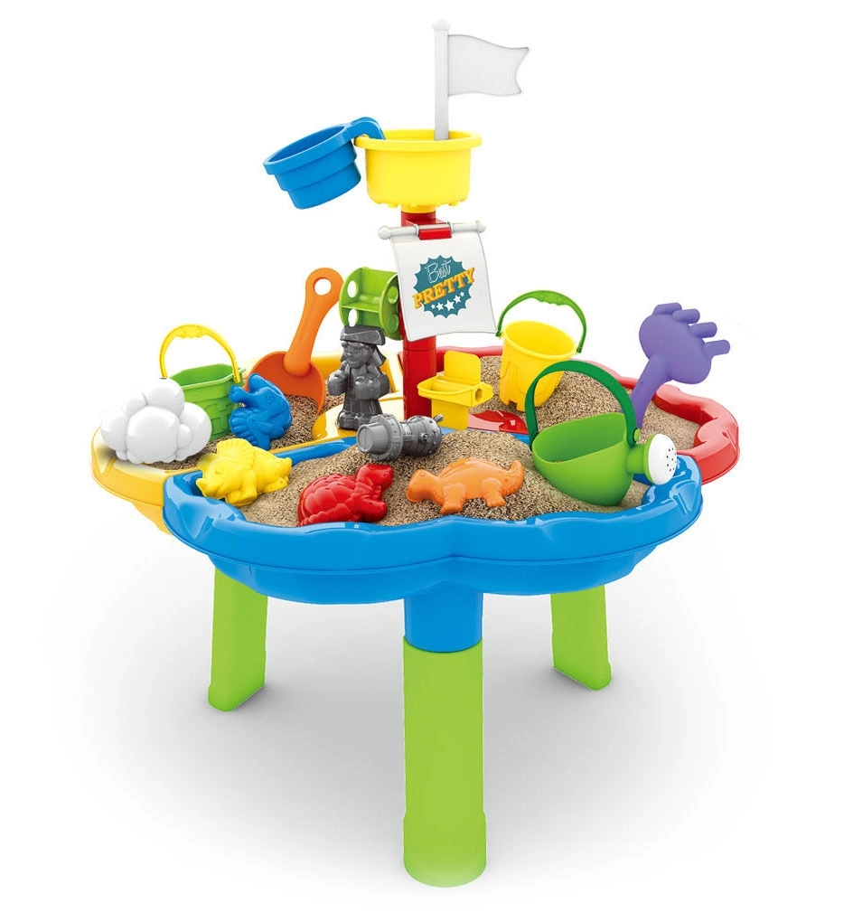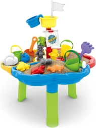 Galds ir sadalīts trīs sekcijās – atsevišķi ūdenim, smiltīm un spēļu zonai. Papildu 13 piederumi sniedz vēl vairāk jautrības! Komplekts ir ideāls gan mājai, gan dārzam, piemēram, pludmalē vai pagalmā.