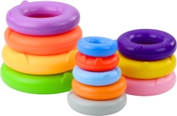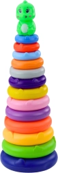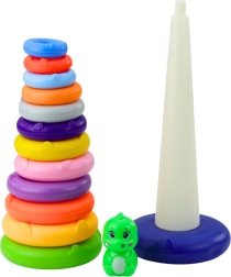 Rotaļlietu veido stingra un stabila pamatne, augsts taps un 13 dažādu izmēru krāsaini gredzeni. Visi elementi ir izgatavoti no viegla un izturīga plastmasas, kas ir droša mazajiem bērniem. Torņa augšdaļu rotā mīļa dinozaura figūriņa, kas piesaista bērna uzmanību un mudina turpināt spēlēties.