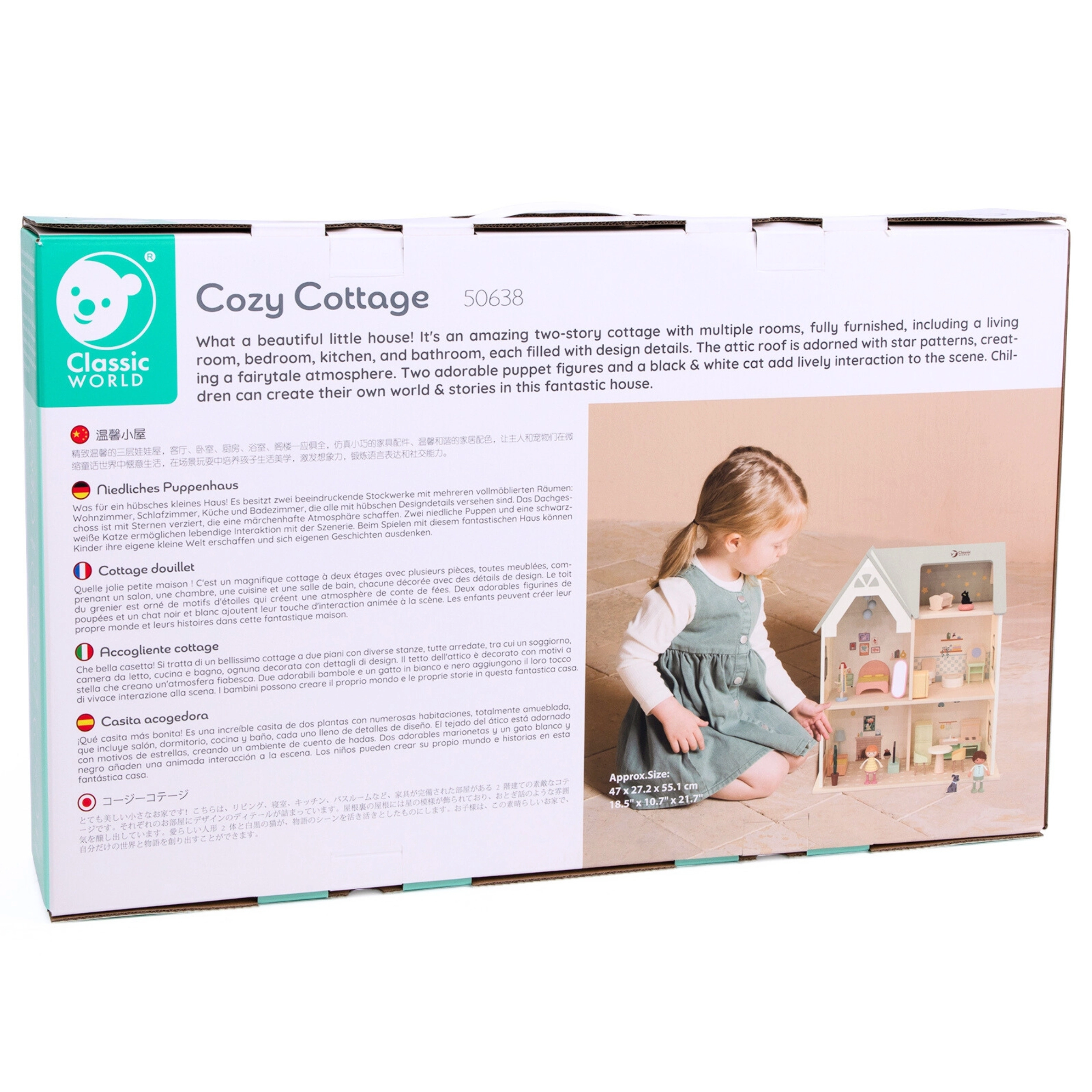Koka leļļu namiņš ar aprīkojumu no Classic World piedāvā skaistu, divstāvu namiņu ar mansardu, kas ir ideāli piemērots mazajiem radošās spēles cienītājiem.