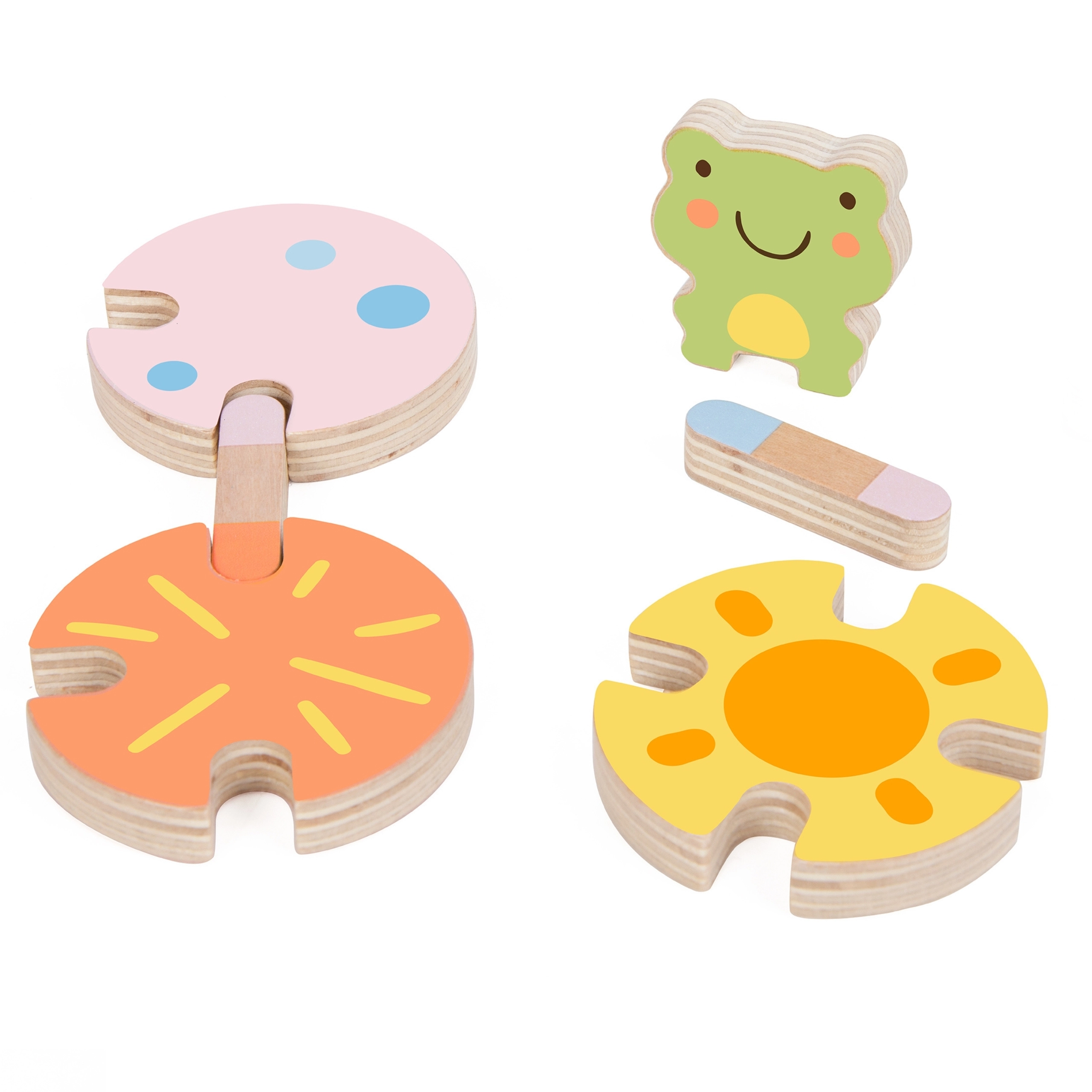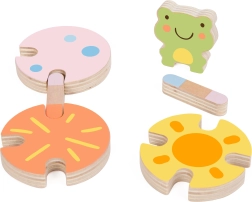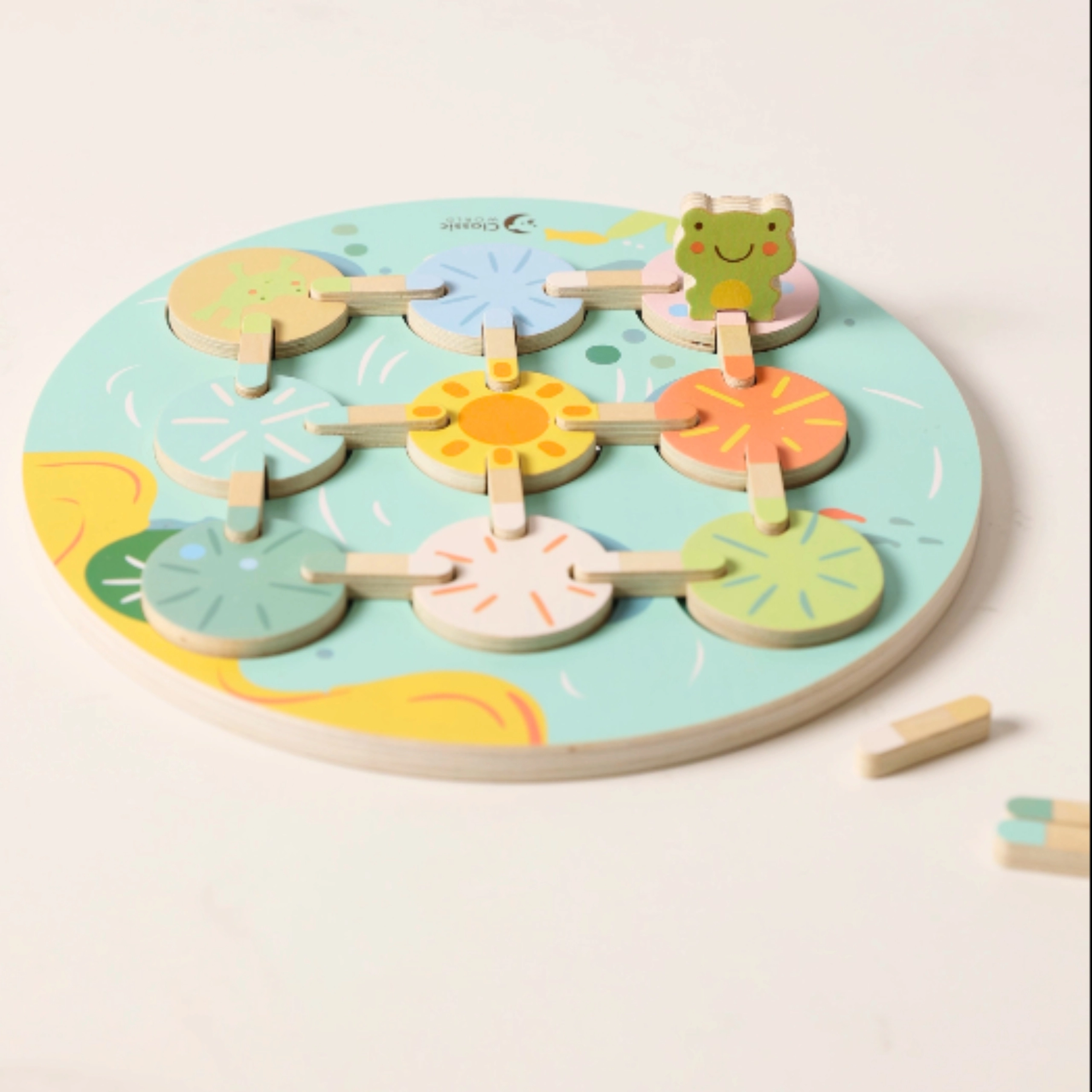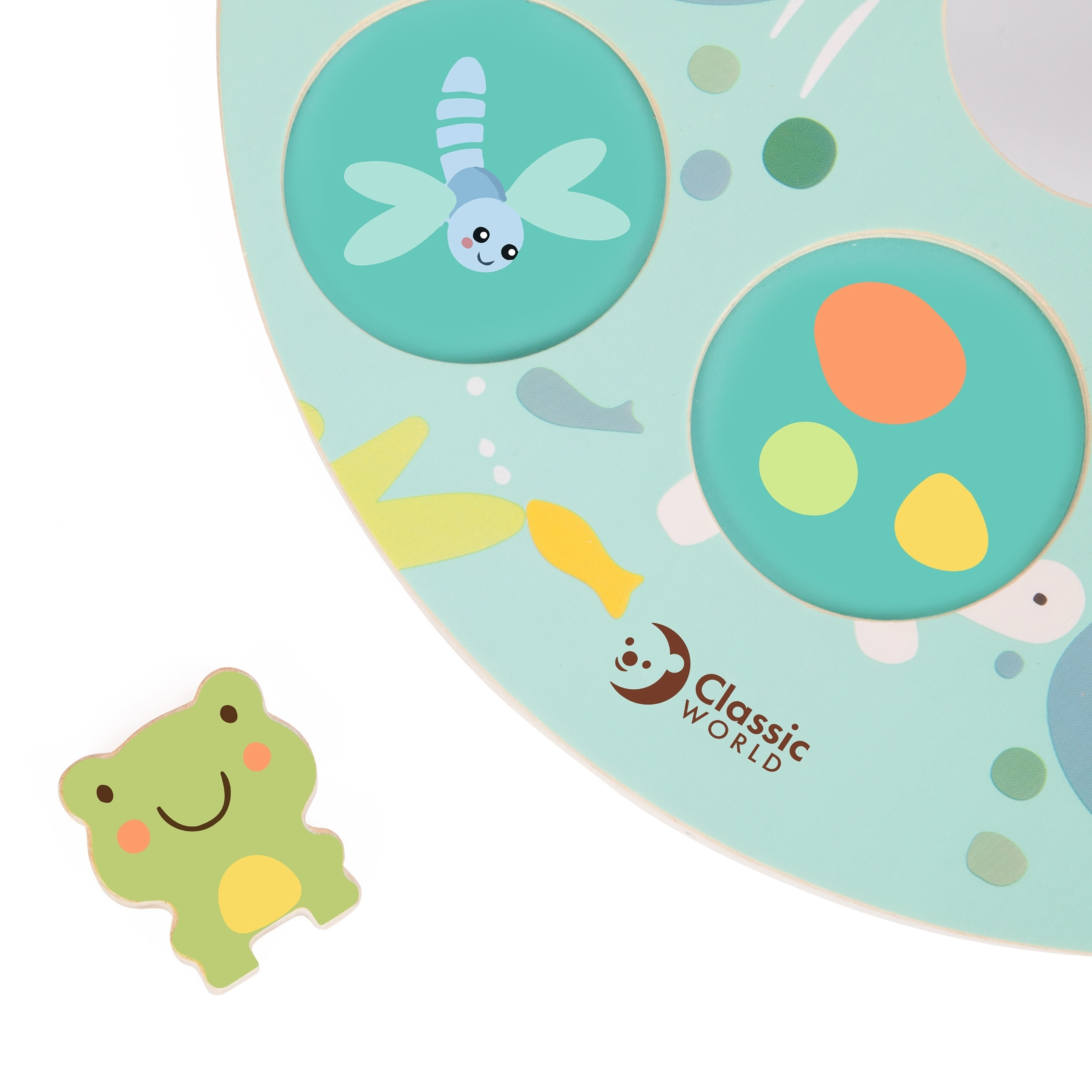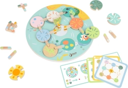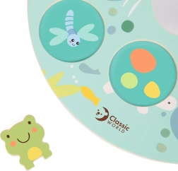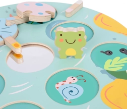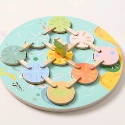 Krāsainā koka vardīte un maigi pasteļtoņi piešķir spēlei estētisku vērtību un palīdz attīstīt krāsu atpazīšanu.