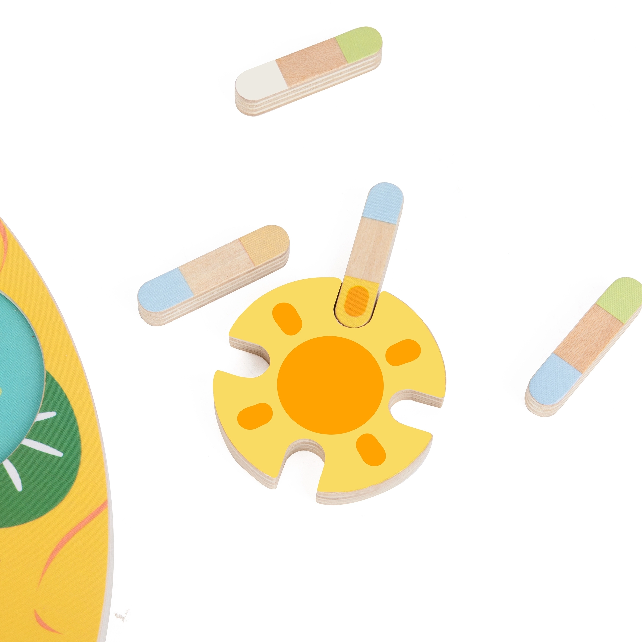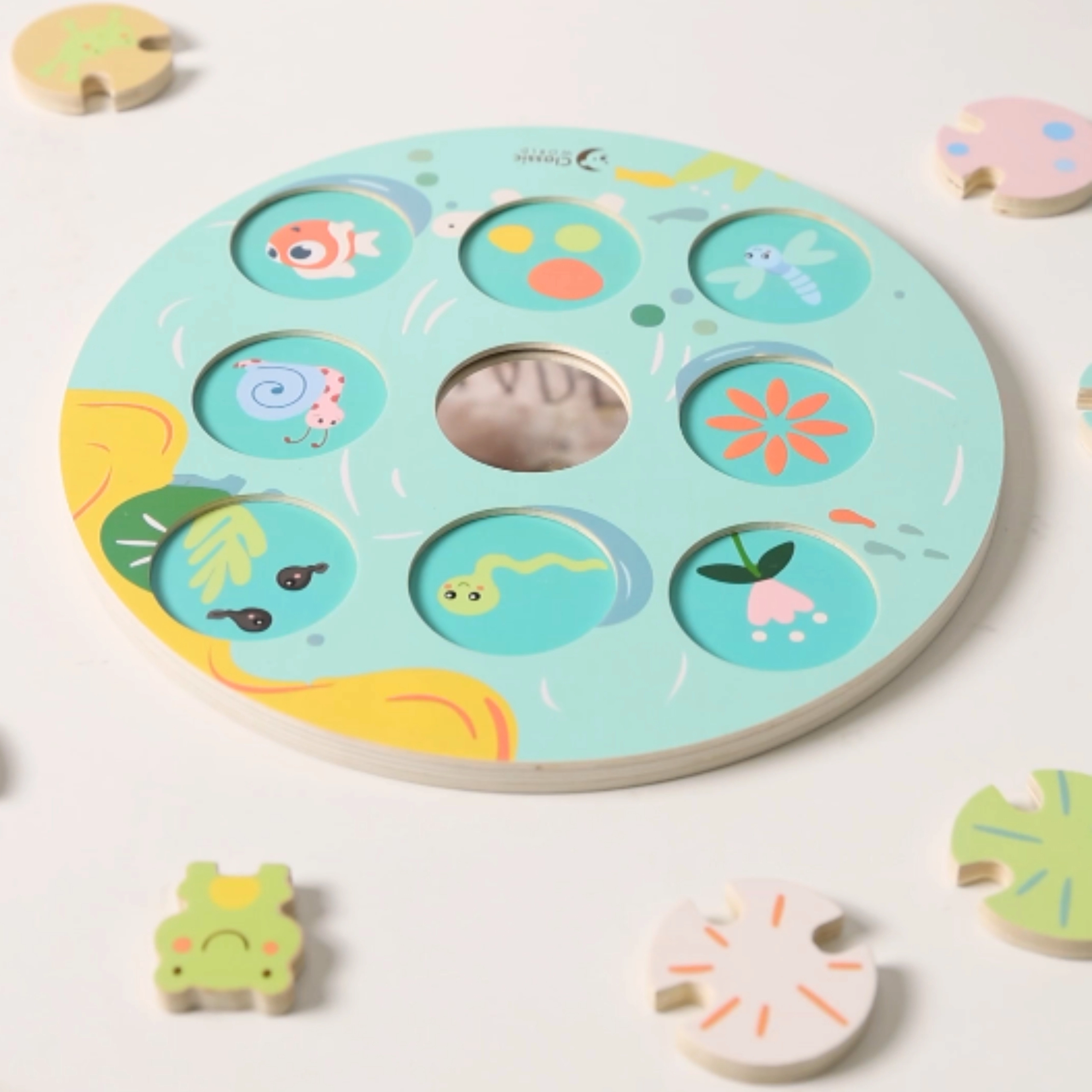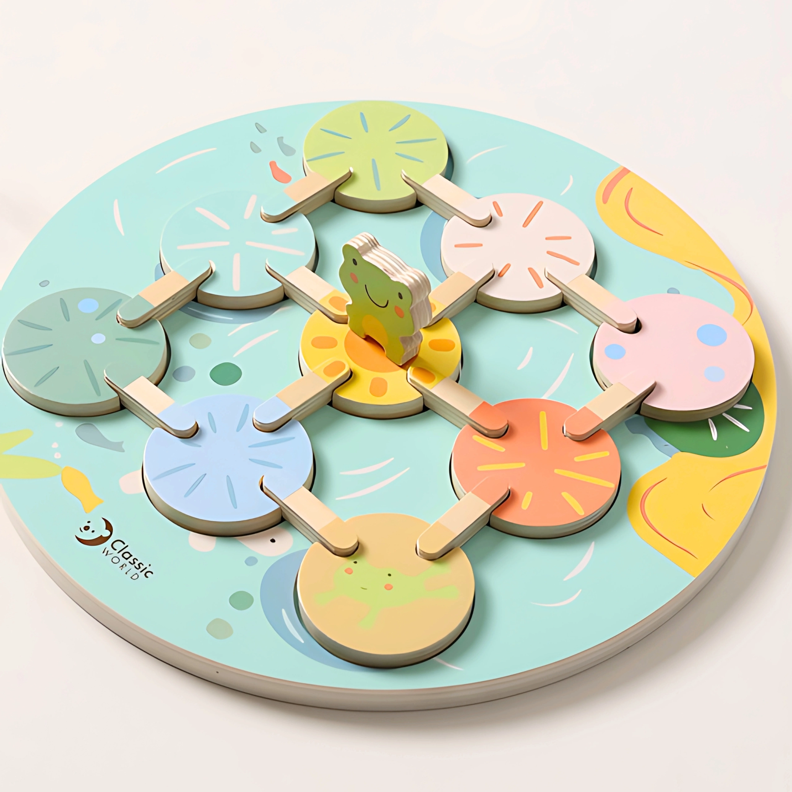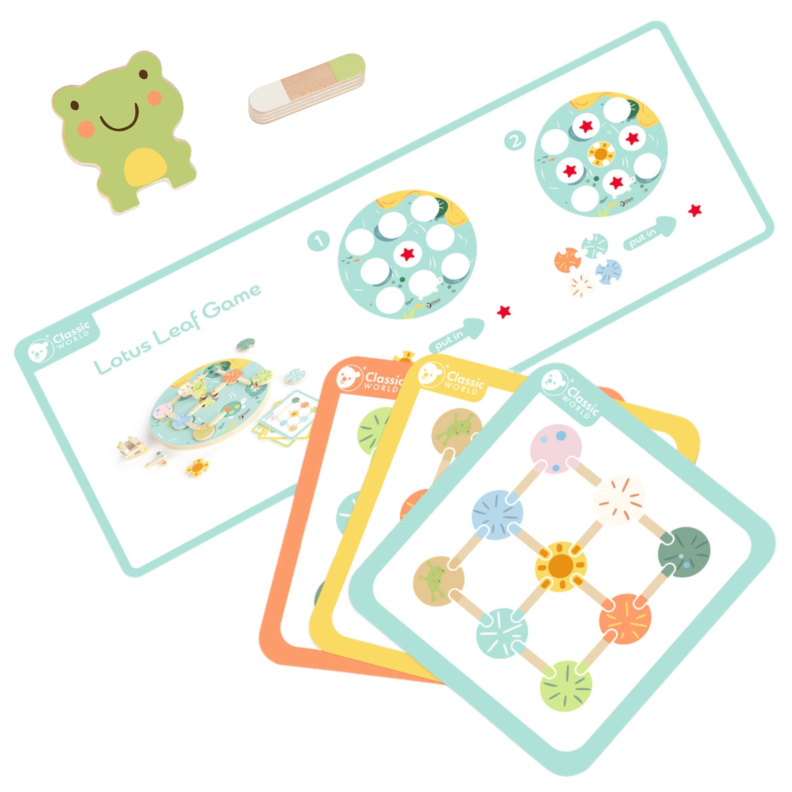 Krāsainā koka vardīte un maigi pasteļtoņi piešķir spēlei estētisku vērtību un palīdz attīstīt krāsu atpazīšanu.