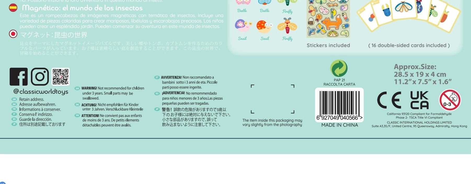 Izmēģiniet unikālo CLASSIC WORLD magnētisko puzles komplektu, kas ietver 66 elementus. Šis komplekts ļauj bērniem veidot dažādus stāstus, izmantojot dzīvnieciņus uz speciālām magnētiskām plāksnēm. Tas ir lielisks veids, kā pavadīt laiku telpās un vienlaikus apgūt ko jaunu.