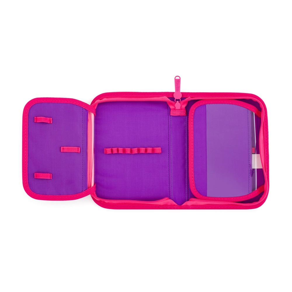 Komplektā ir praktisks maisiņš sporta tērpam vai maiņas apaviem, kas vienkārši aizverams, savelkot aukliņas. Vienas kārtas skolas penālis ar diviem atlociņiem piedāvā gumijas cilpiņas rakstāmpiederumu nostiprināšanai un caurspīdīgu plēvi stundu sarakstam.
