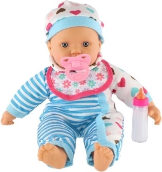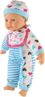 Lellīte ir ģērbta zilbalti svītrainā tērpiņā ar mīlīgām sirsniņām. Komplektā ir knupītis un pudelīte, kas piešķir spēlei reālistisku elementu.