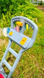 Vieglā konstrukcija, robusts rokturis un lielie riteņi nodrošina ērtu stumšanu pa zālienu un cietām virsmām. Rotaļlieta veicina kustības, iztēli un lomu rotaļas, tāpēc tā ir lieliski piemērota āra izklaidei dārzā, uz terases vai parkā.