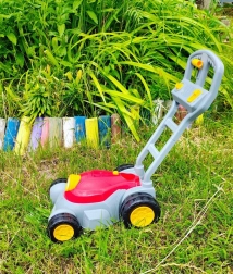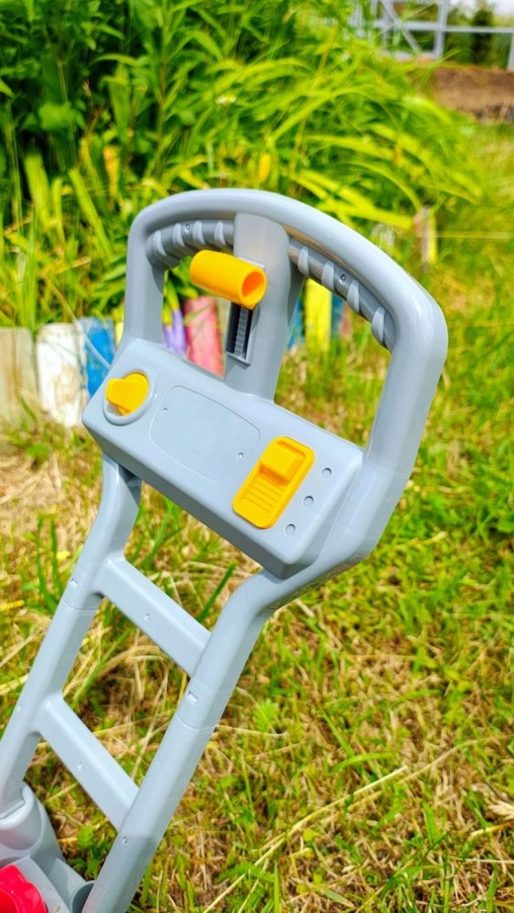 Izturīgais plastmasas rokturis un lielie riteņi atvieglo stumšanu pa dārzu. Vieglā konstrukcija ir ideāla mazām rokām.