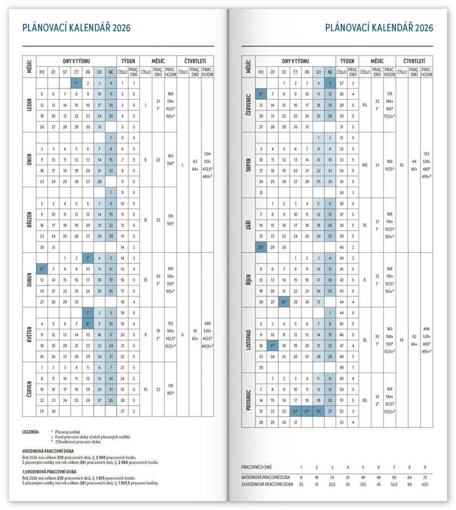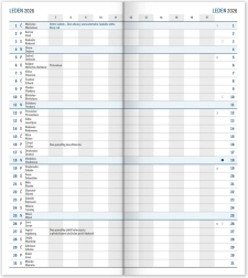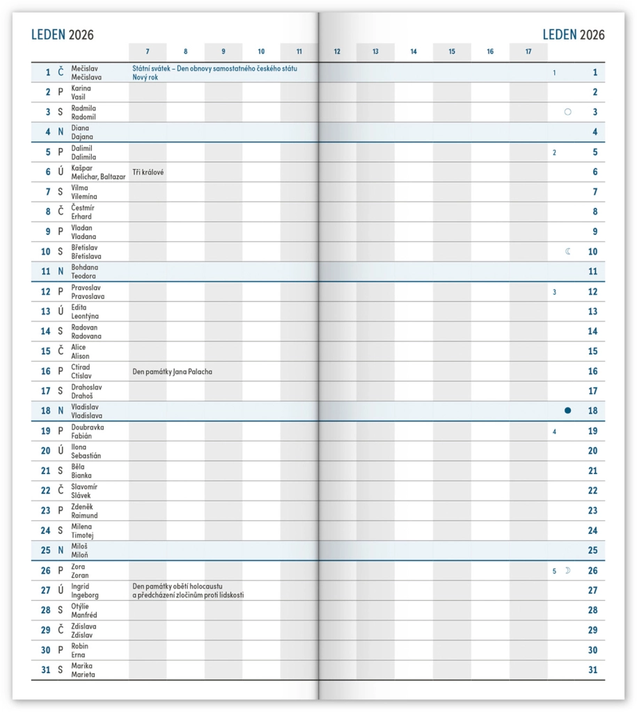 Dienasgrāmata ir ideāli piemērota jūsu laika plānošanai, pateicoties mēneša pārskatam. Tā ir aprīkota ar čehu kalendāriju, kurā iekļauti svarīgi dati, piemēram, vārdi, svētki un atceres dienas, kas ir lieliski piemērots ikdienas lietošanai.