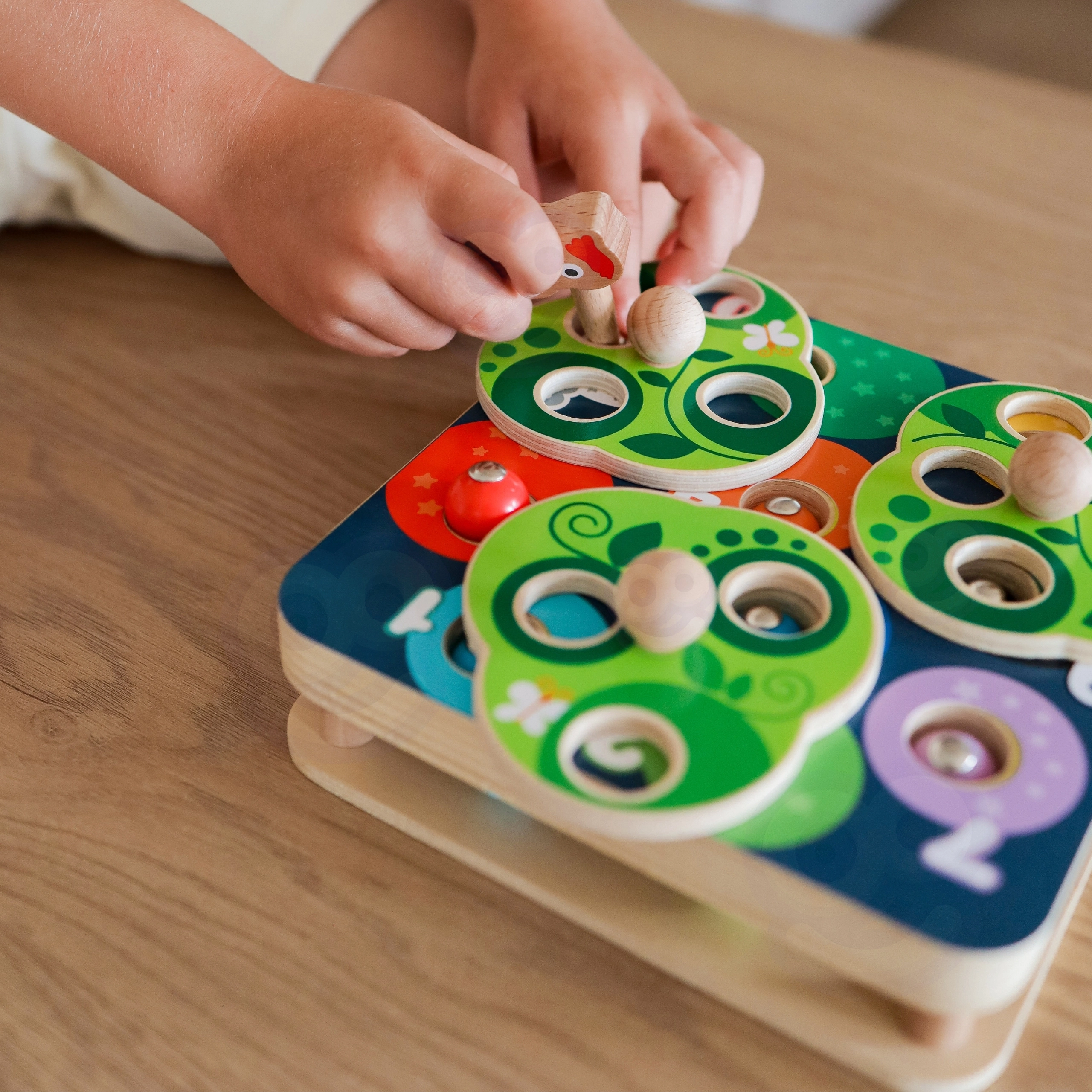 Koka putniņš ar magnētisku knābi ļauj viegli noķert un pārvietot tārpiņus. Bērni trenē precizitāti, tvērienu un acu–roku koordināciju ar katru “lēciens uz medījumu”.