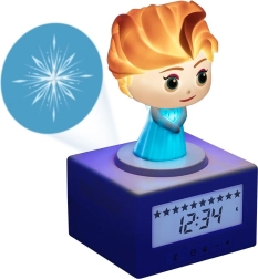Spīdošs galda modinātājs ar princeses Elzas figūriņu no filmas Frozen. Iekļauts USB kabelis barošanai un projekcija uz sienas ērtākai iemigšanai.