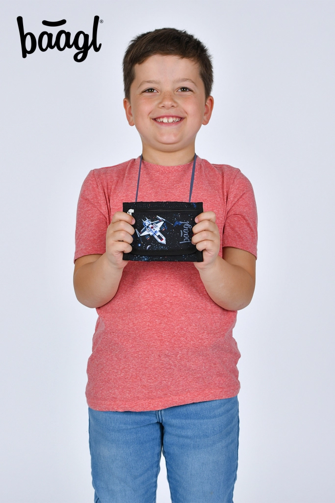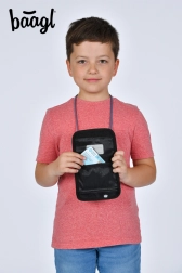 Praktisks maciņš ap kaklu ar vārda zīmīti, regulējamu aukliņu un vietu sīknaudai, pusdienu mikroshēmai vai atslēgām.