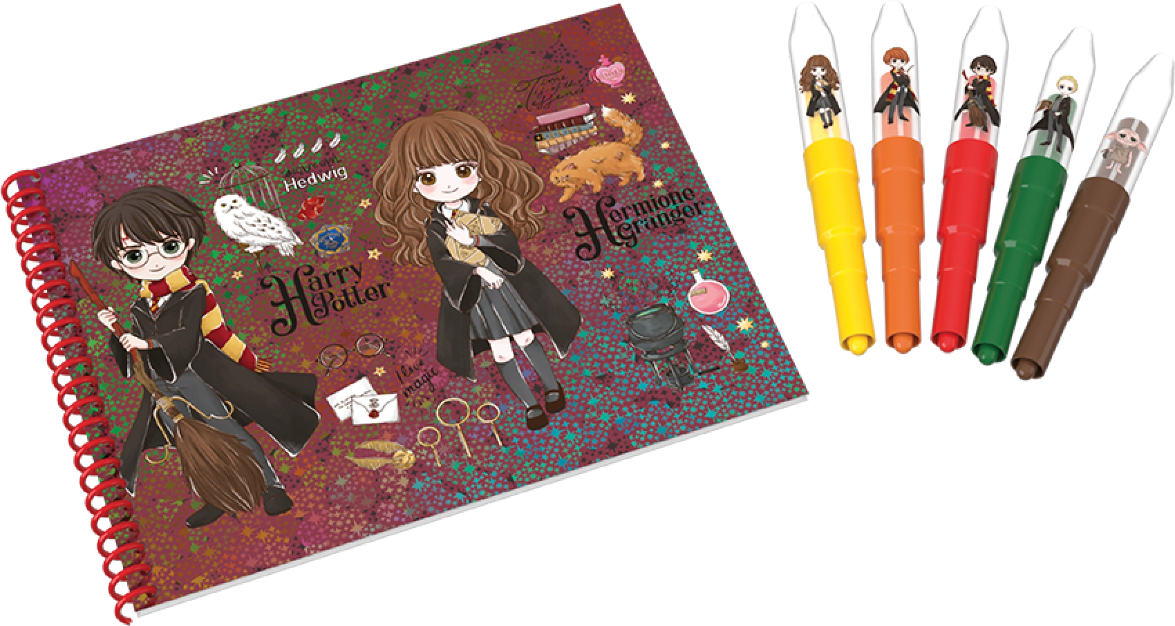 Pūšamo flomāsteru komplekts ar Harija Potera motīviem sniedz gan izklaidi, gan radošu pašizpausmi. Bērni, vienkārši pūšot caur flomāsteriem, var veidot krāsainus izsmidzināšanas efektus. Papildus flomāsteriem komplektā ir arī piezīmju blociņš ar iepriekš iespiestiem Harija Potera motīviem, kurus var izkrāsot vai papildināt ar saviem zīmējumiem.