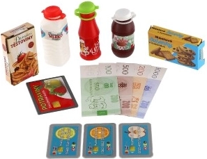 - Banknošu, monētu un pārtikas maketi – viss pilnvērtīgam veikala aprīkojumam.