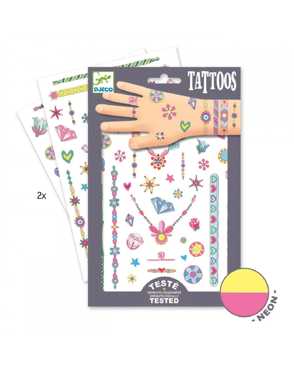 Atklājiet DJECO tetovējumu burvību, kas ļauj bērniem attīstīt fantāziju un izpaust savu personīgo stilu. Komplektā ietilpst dažādi droši un viegli lietojami raksti un motīvi.