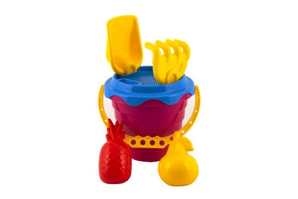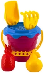 Komplektā atradīsiet visu nepieciešamo spēlēm smiltīs, tostarp spainīti, sietiņu, lāpstiņu, grābeklīti un divas formiņas.