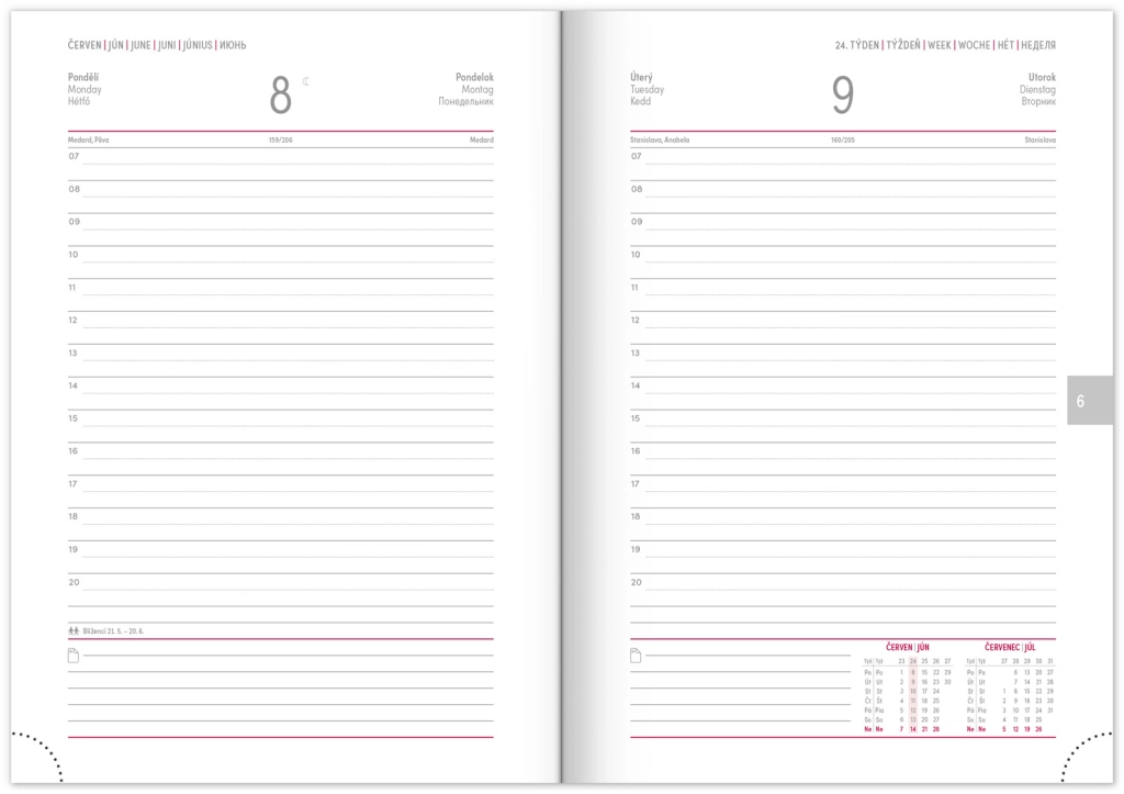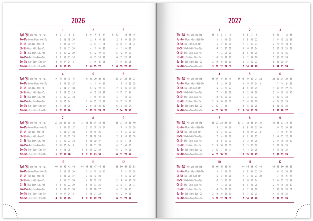 Elegantais dienas plānotājs Balakon 2026 stilīgā bordo krāsā ir ideāls sabiedrotais ikdienas plānošanai. Plānotājam ir izturīga virsma un čehu–slovāku kalendārijs, ko papildina citu valodu versijas.