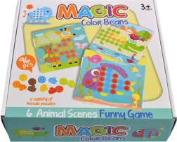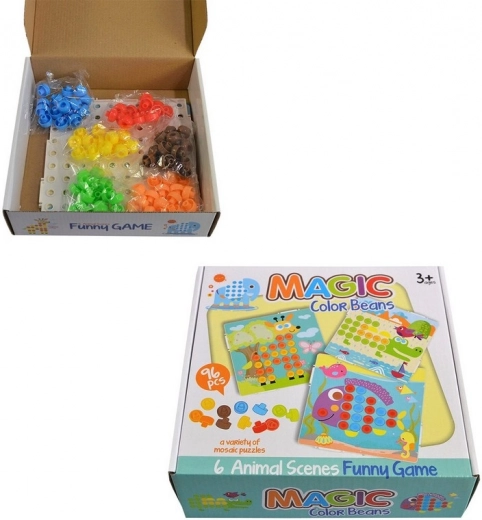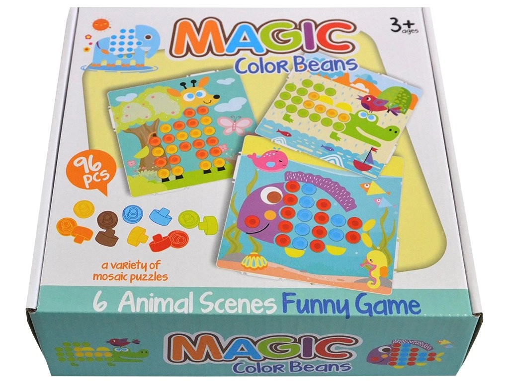 Mozaīka ar krāsainiem paraugiem ir ideāli piemērota radošiem bērniem. Tā ietver 6 dažādas vides, kurās dzīvo dzīvnieki. Bērni var papildināt dzīvnieku ķermeņus ar košām saspraudēm.