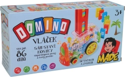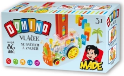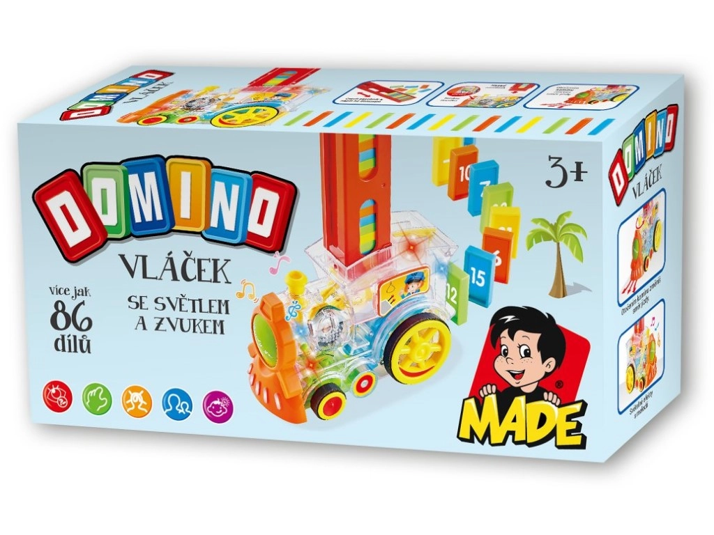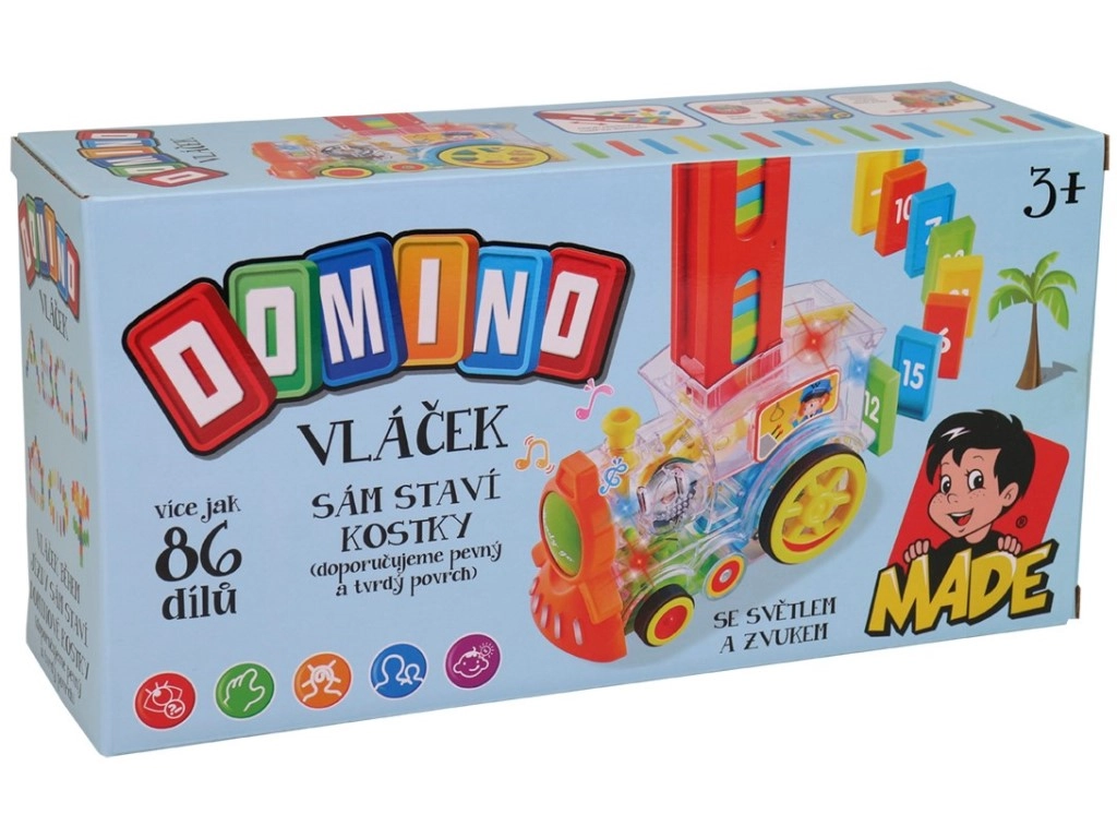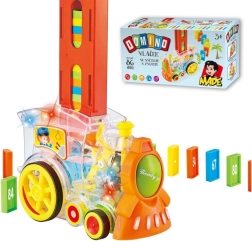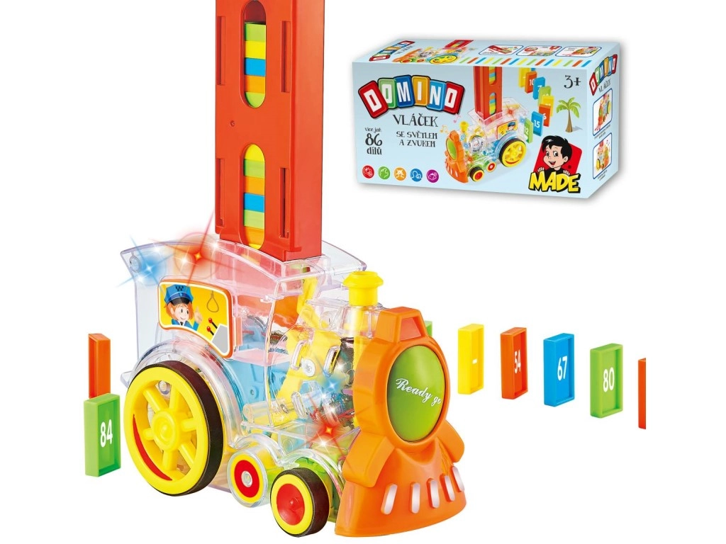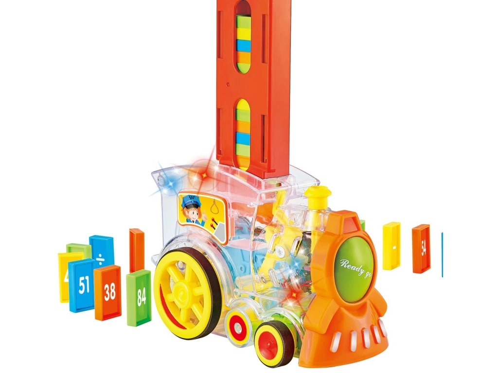 Caurspīdīga lokomotīve bērniem piedāvā izklaidi ar 86 domino kauliņiem un aizraujošiem gaismas efektiem. Izbaudiet muzikālu braucienu pilnu krāsu un izveidojiet perfekto domino efektu.