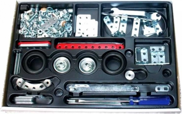 Konstruktors ietver 230 metāla detaļas, tostarp skrūves, uzgriežņus un citus komponentus, kas sakārtoti melnā nodalījumā.