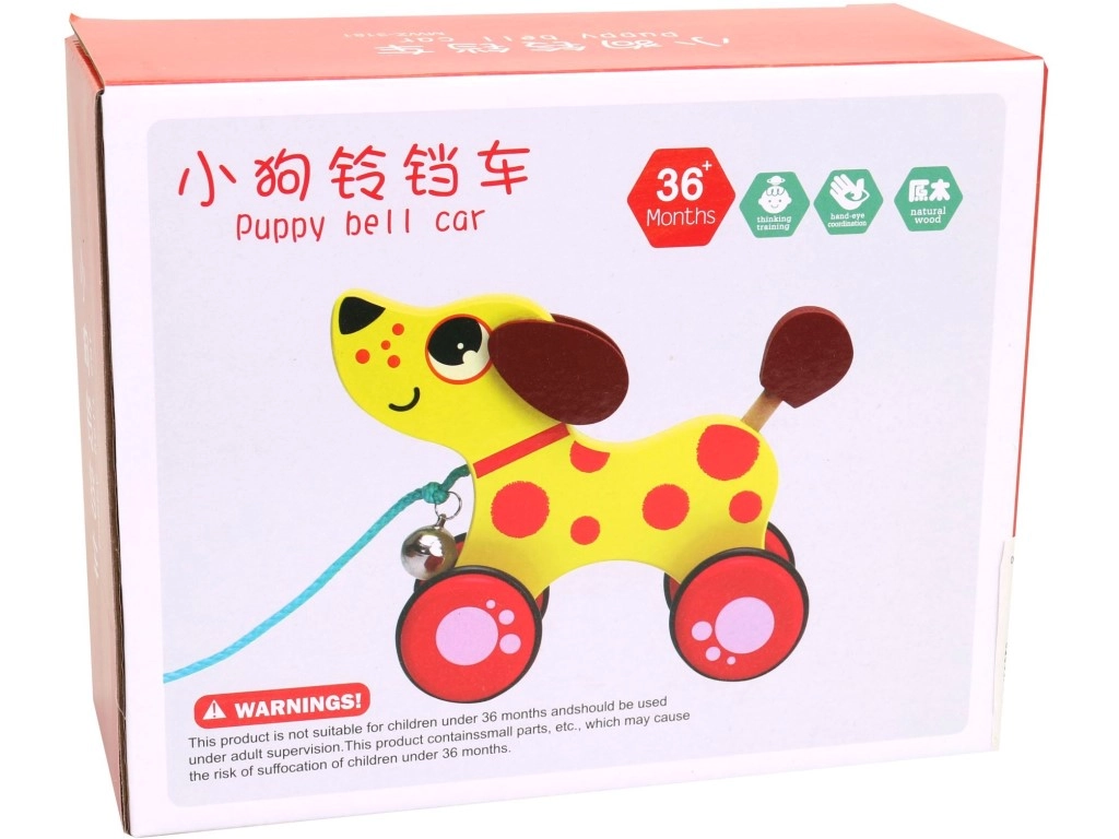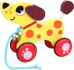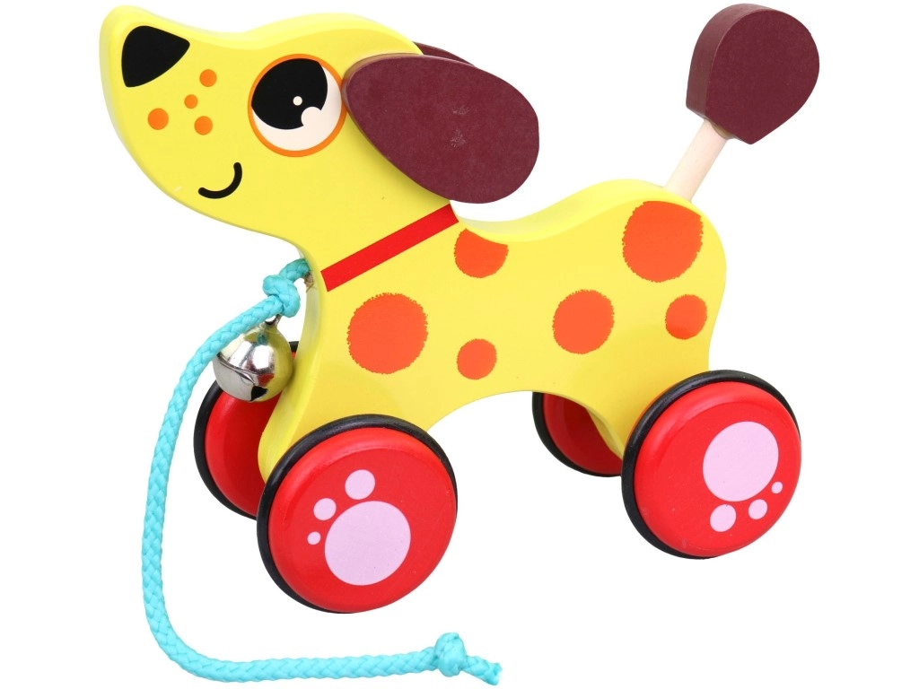 Šī mīlīgā koka velkamā rotaļlieta suņa veidolā piedāvā ne tikai krāsu daudzveidību, bet arī interaktīvu elementu – zvaniņu, kas kustības laikā rada maigu skaņu. Izklaide bērniem ir garantēta!