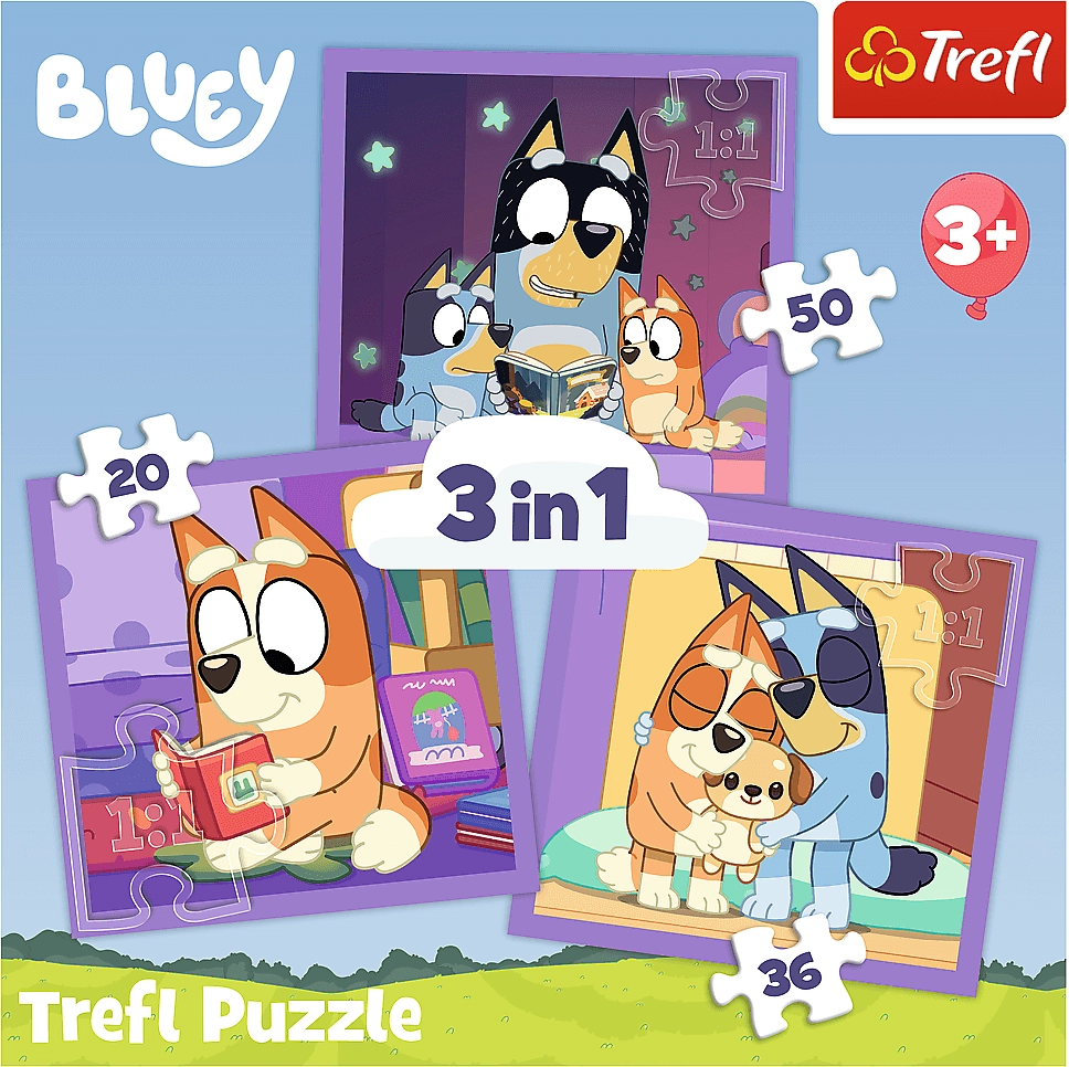Atklājiet likšanas burvību ar puzzle TREFL Iepazīsti Bluey 3 vienā. Šī puzle piedāvā:
