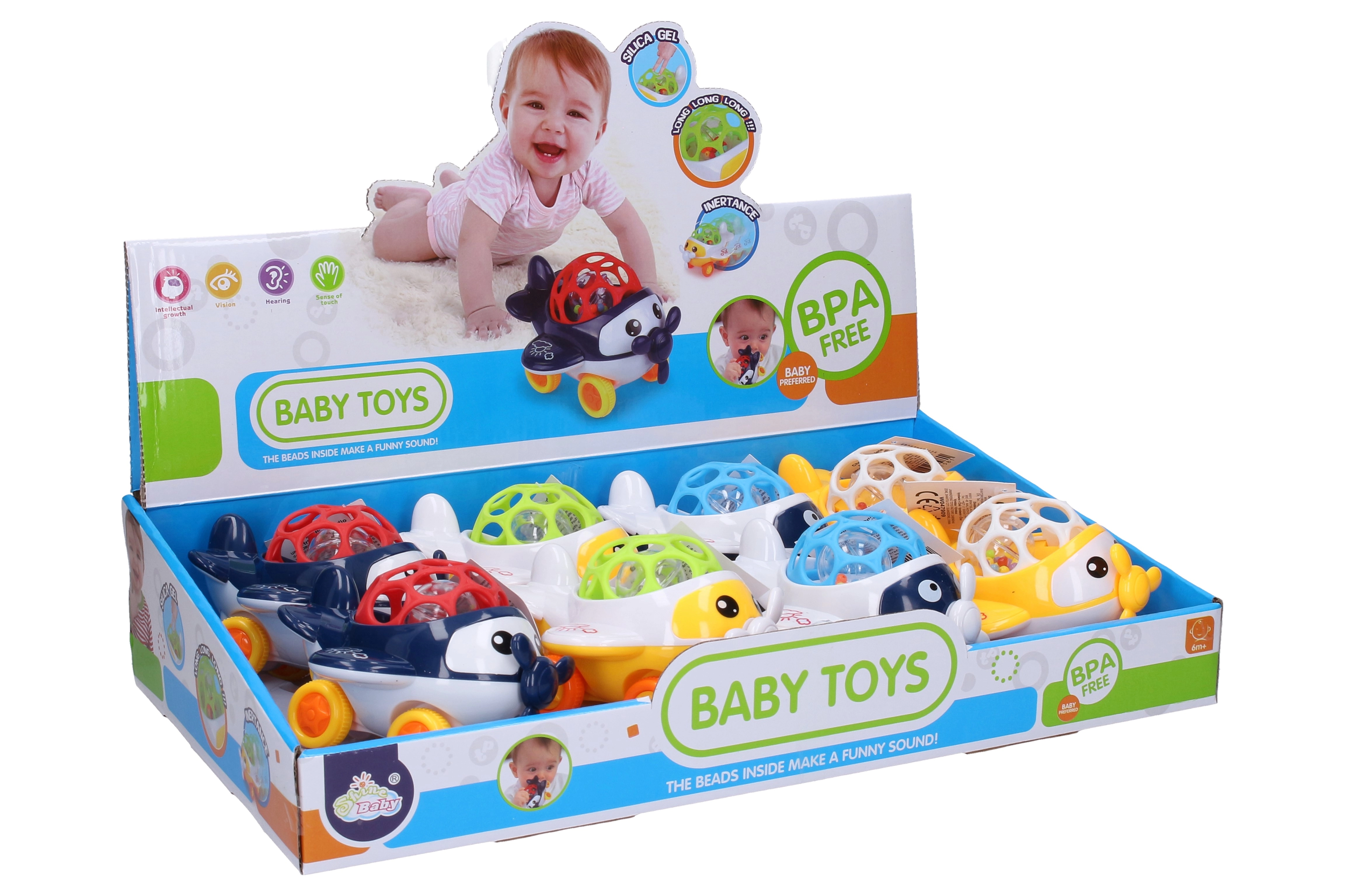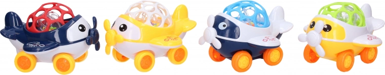 Rotaļu lidmašīna ar brīvriteņa riteņiem ir lieliski piemērota bērnu izklaidei un attīstībai. Šie grabuļi ir pieejami četrās krāsu variācijās: zila, zaļa, balta un sarkana. Pateicoties izmēram 11x11x8 cm, bērniem to ir viegli satvert un ar to darboties.