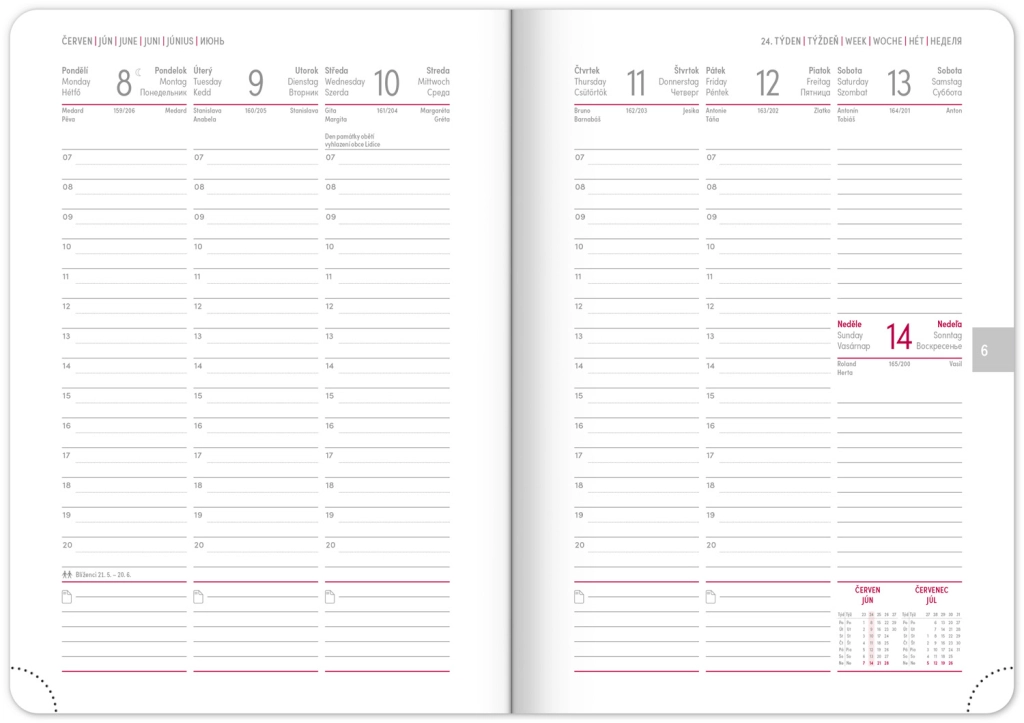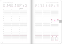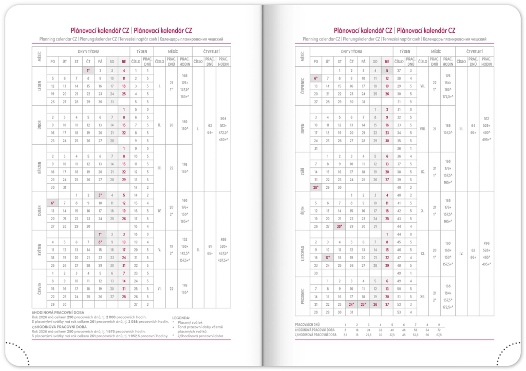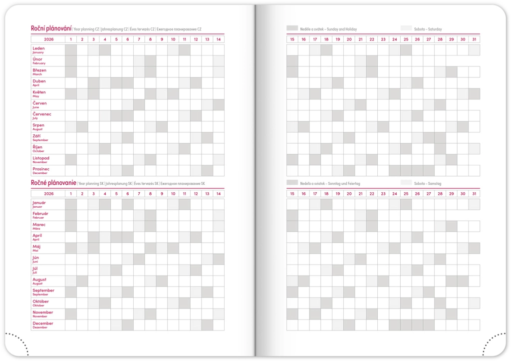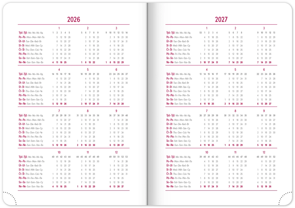 Eleganta nedēļas dienasgrāmata Ajax 2026 zelta krāsā ar viegli teksturētu virsmu un netipisku reljefu ir ideāls pavadonis ikdienai. Pateicoties čehu–slovāku kalendārijam un papildus angļu, vācu, ungāru un krievu valodai, tā ir praktiska un pielāgojama ikvienam.