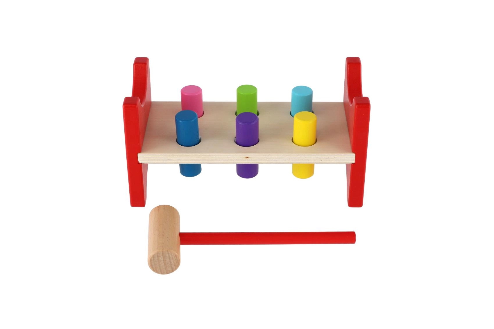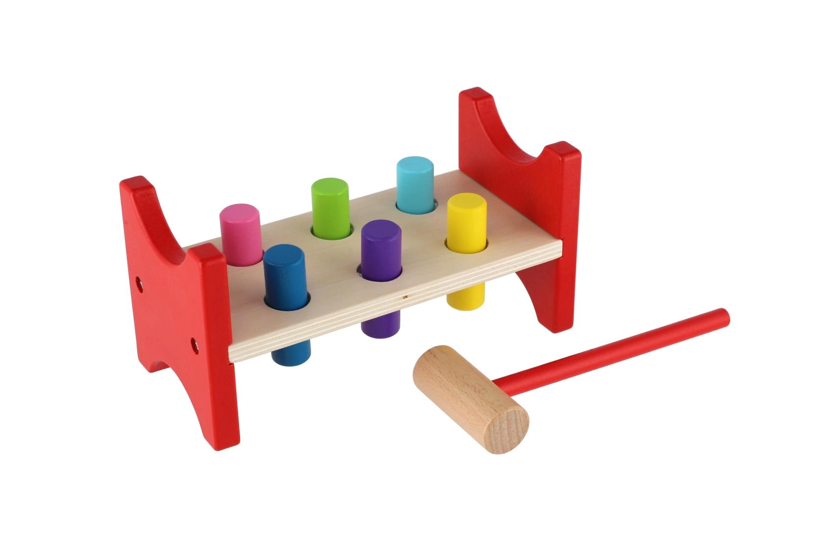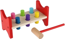Šī laikmetīgā koka rotaļlieta veicina dabisku mācīšanos caur spēli. Bērni ar āmuriņu iedzen krāsainās tapas atverēs, tādējādi trenējot kustību precizitāti, ritmu un pacietību. Izturīgais koka sols apvienojumā ar droši noapaļotām malām nodrošina ilgu kalpošanas laiku un drošu lietošanu.