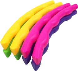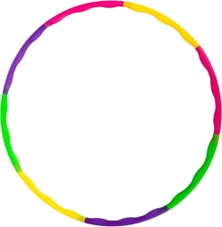 Aplis ar 50 cm diametru sastāv no 7 vieglām un viegli savienojamām daļām, kas ļauj ātru montāžu un vienkāršu pārnēsāšanu, kā arī uzglabāšanu – perfekti lietošanai mājās vai ceļā. Krāsainie segmenti dzeltenā, zaļā, violetā un rozā krāsā piešķir Hula hopam pievilcīgu izskatu un motivē kustēties.