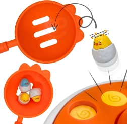 Bāze ar melodijām un rotāciju ļauj cālīšiem nejauši “izlekt”, tāpēc bērni trenē reakciju un koordināciju to ķeršanas laikā.