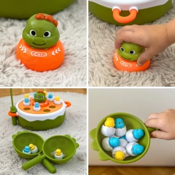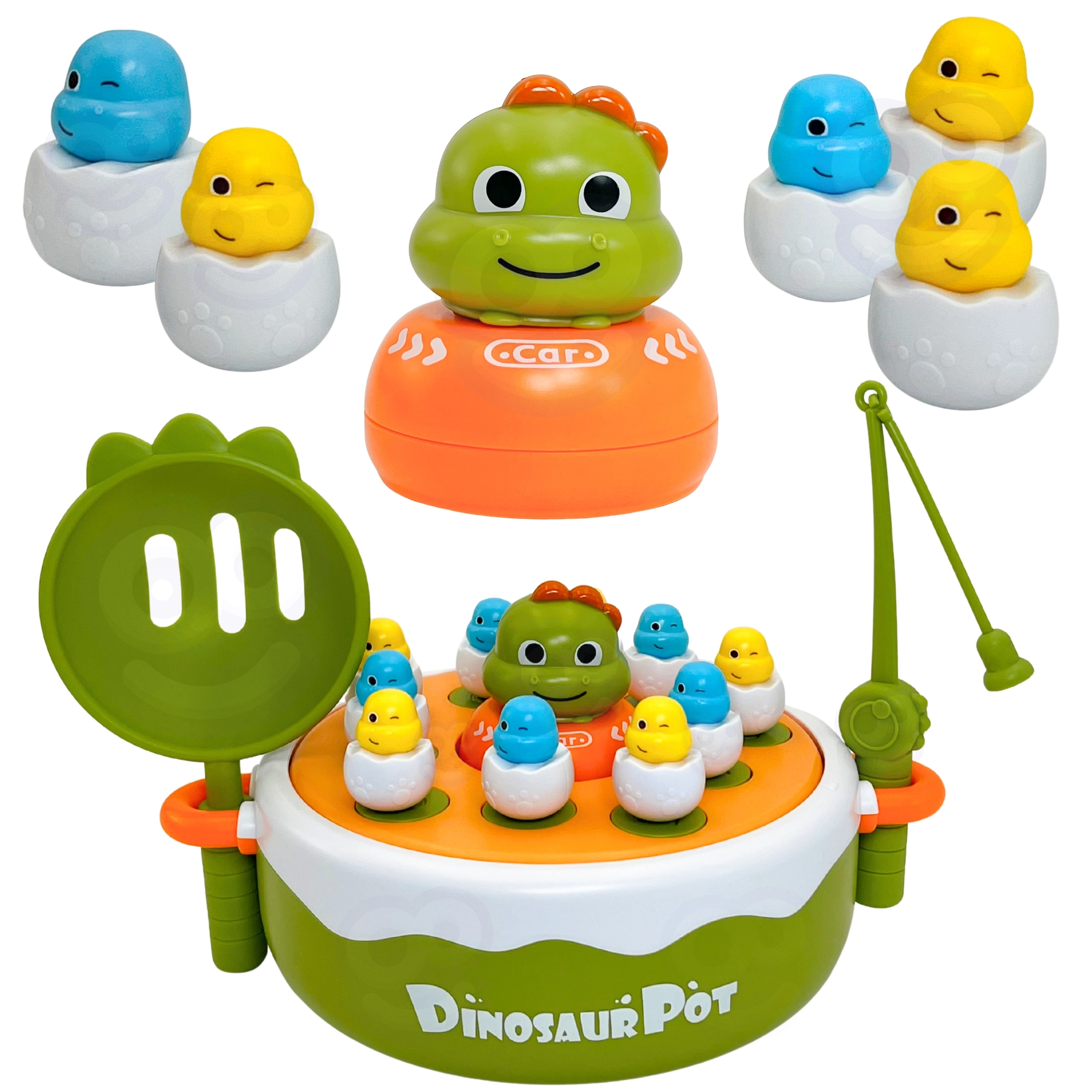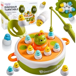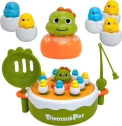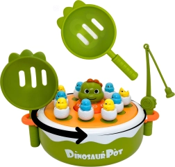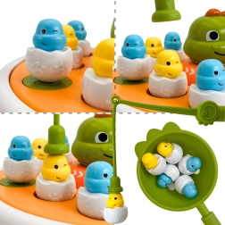 Spēles pamatne ar rokturiem ir kompakta un gatava ātrai darbībai: bērni var ķert dino-cāļus ar magnētisko makšķeri vai tos katapultēt un ķert ar lāpstiņām. Otrā pamatnes pusē atradīsiet desas mierīgākai sacensībai, bet lielais, mīlīgais dinozaurs–automašīnīte piešķir spēlei papildu fantāzijas dimensiju.