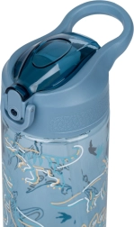 Rotaļīgas dinozauru ilustrācijas uz pudeles, kas noteikti iepriecinās ikvienu bērnu.