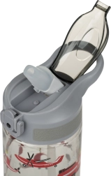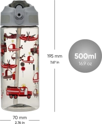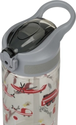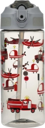 Caurspīdīga plastmasas pudele ar sarkano ugunsdzēsēju automašīnu un helikopteru attēliem ir ideāla jautrībai ar katru malku.