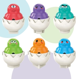 Woopie rotaļu olas iepazīstina jūsu bērnu ar pasauli, kas pilna krāsu, formu un jautrām sejiņām. Katra no sešām mīļajām olām slēpj krāsainu cālīti ar smieklīgu sejas izteiksmi, un, to nospiežot, atskan skaņas efekts. Uzdevums ir ne tikai salikt pareizo čaumalu, bet arī novietot to pareizajā vietā turētājā.