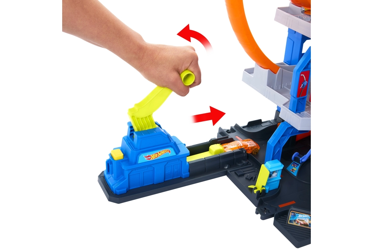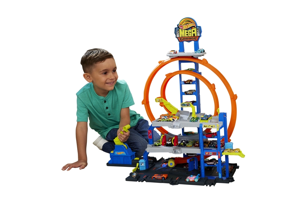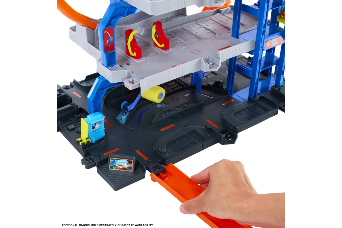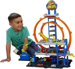 Hot Wheels City maksi garāža sniedz dinamisku spēli trīs stāvos — no automazgātuves pirmajā stāvā līdz rokām darbināmam liftam un startam no augšējā līmeņa. Palaidējs sūta auto caur dubulto cilpu, bet pārslēdzēji nosaka, kurā stāvā tas nonāks. Lieliski piemērots gan individuālai, gan kopīgai spēlei.