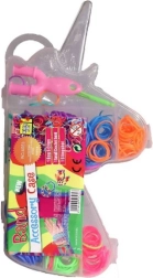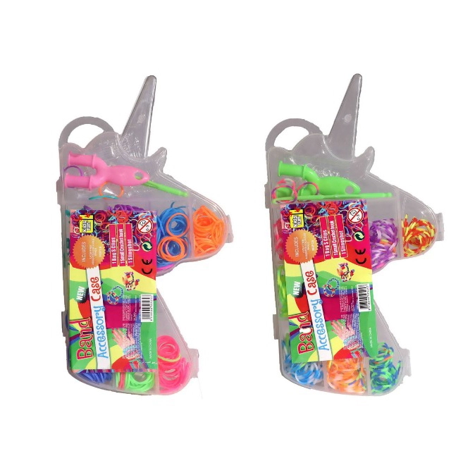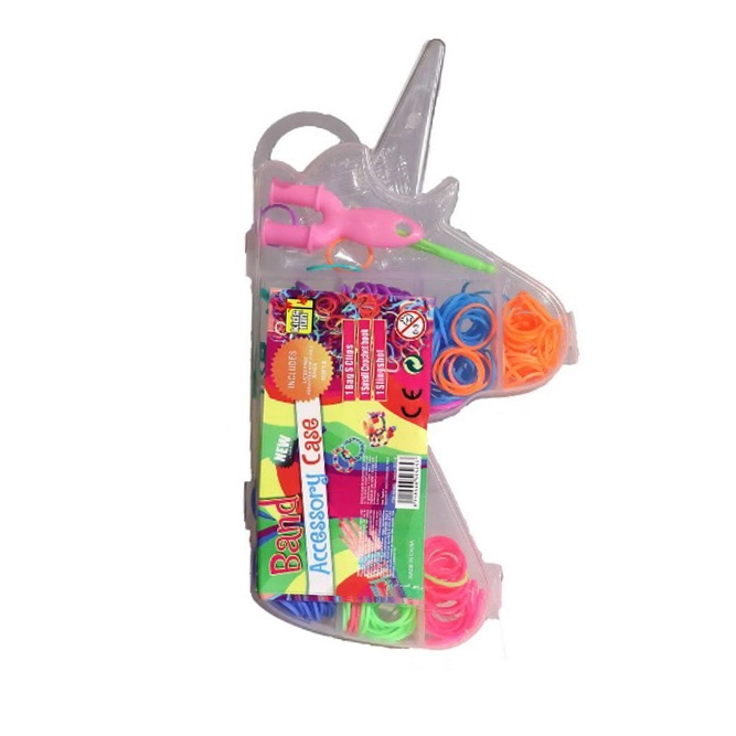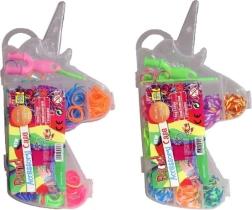 Viss ir glīti iepakots ērtā plastmasas kastītē vienradža formā ar mazākiem nodalījumiem ērtai gumiju sakārtošanai pa krāsām. Šis komplekts ir ne tikai izklaidējošs, bet arī attīsta bērnu radošumu un sīko motoriku.