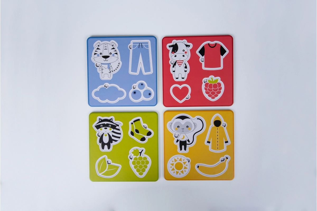 - 4 krāsainas puzļu pamatnes – pakāpeniska grūtības pakāpe prasmju secīgai attīstībai