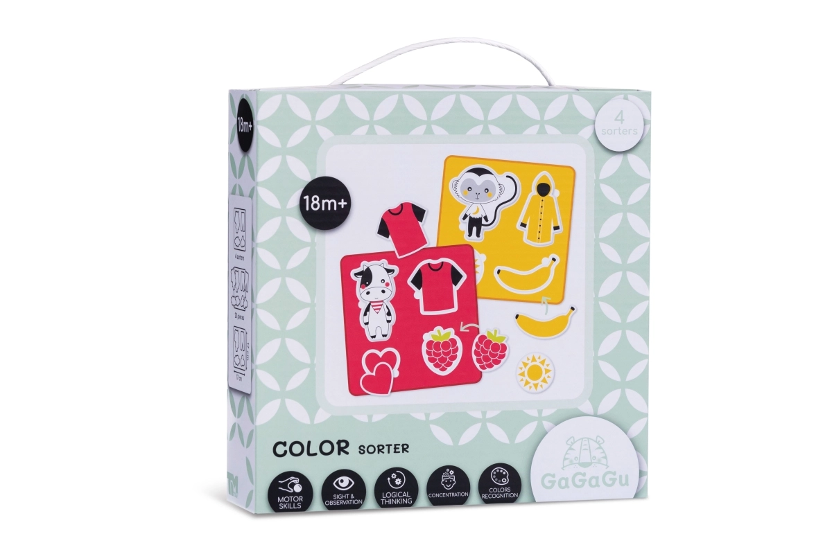 Šis GAGAGU krāsu iepazīšanas komplekts bērniem piedāvā jautru mācīšanās veidu. Četras puzļu pamatnes dažādās krāsās un ar atšķirīgu grūtības pakāpi palīdz mazajiem atšķirt krāsas, formas un ievietot gabaliņus pareizajās vietās. Mīlīgie dzīvnieciņu attēli un to iecienītie ēdieni veicina cēloņsakarību izpratni un paplašina vārdu krājumu.