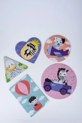 Šis daudzveidīgais komplekts ietver 9 puzles ar pakāpeniski pieaugošu grūtības pakāpi (2–6 gabaliņi), tāpēc tas lieliski pielāgojas jūsu bērna attīstības tempam. Lieli, viegli satverami gabaliņi un rotaļīgas dzīvnieku ilustrācijas veicina pārliecību salikšanā un prieku par sasniegumiem.